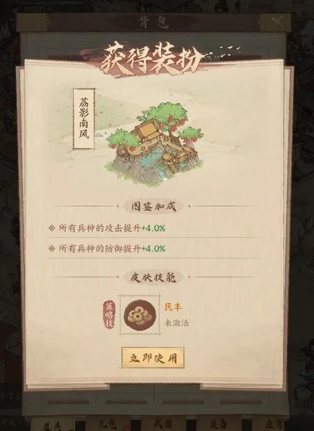 获取该道具后,可手动激活九州县邑的初阶[荔影南风]装扮。获得装扮后,可前往书阁-图鉴激活: