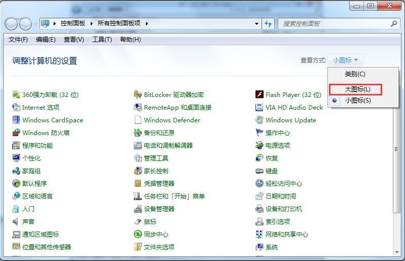 2、进入控制面板页面,当前默认查看方式是“类别”,并没有找到鼠标相关设置,我们将其修改成“大图标”。