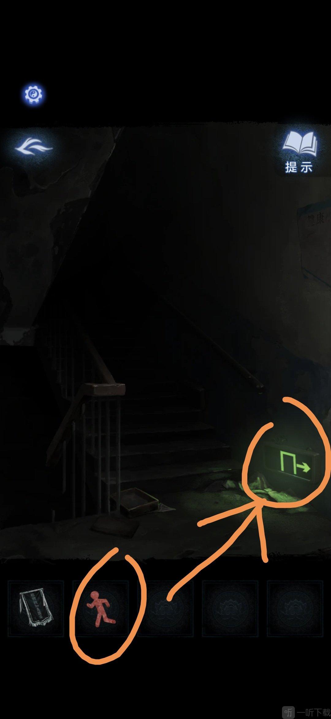 把剪纸小人放在楼梯间的安全通道标志上, 楼梯间亮起
