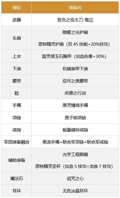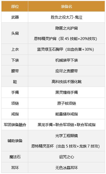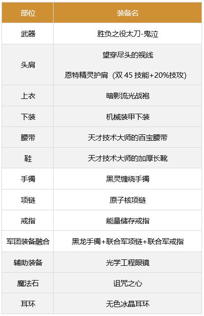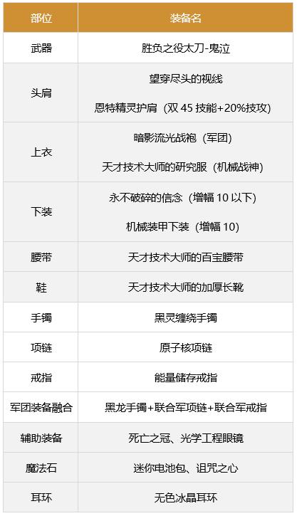 备注:恩特精灵护肩最低要求是双45技攻+20%的属性才可替换望穿尽头的视线,军团一直在一个房间,故衣服选择暗影流光战袍,天才衣服适合机械战神,暗影战袍适合军团。