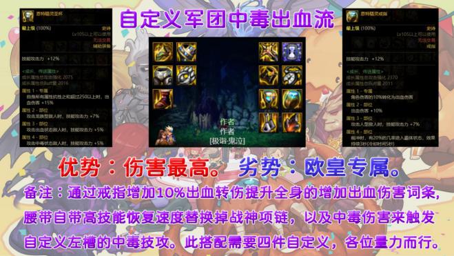 备注:通过戒指增加10%出血转伤提升全身的增加出血伤害词条,腰带自带高技能恢复速度替换掉战神项链,以及中毒伤害来触发自定义左槽的中毒技攻。此搭配需要四件自定义,各位量力而行。