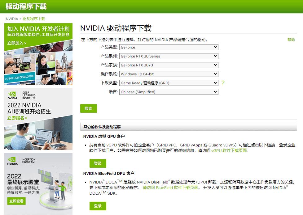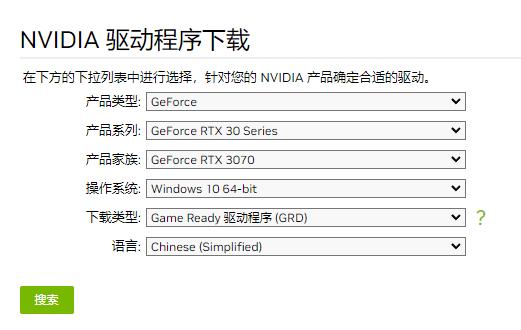 2.前往NVIDIA官网,查询显卡型号对应的最新驱动版本,若不是最新请下载更新。