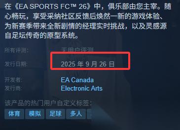 EA Sports FC 26将于2025年9月26日正式发售,由EA Canada负责开发,Electronic Arts负责发行。