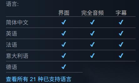 游戏提供多语言本地化支持,包含简体中文、英语、法语、意大利语和德语等语言版本。