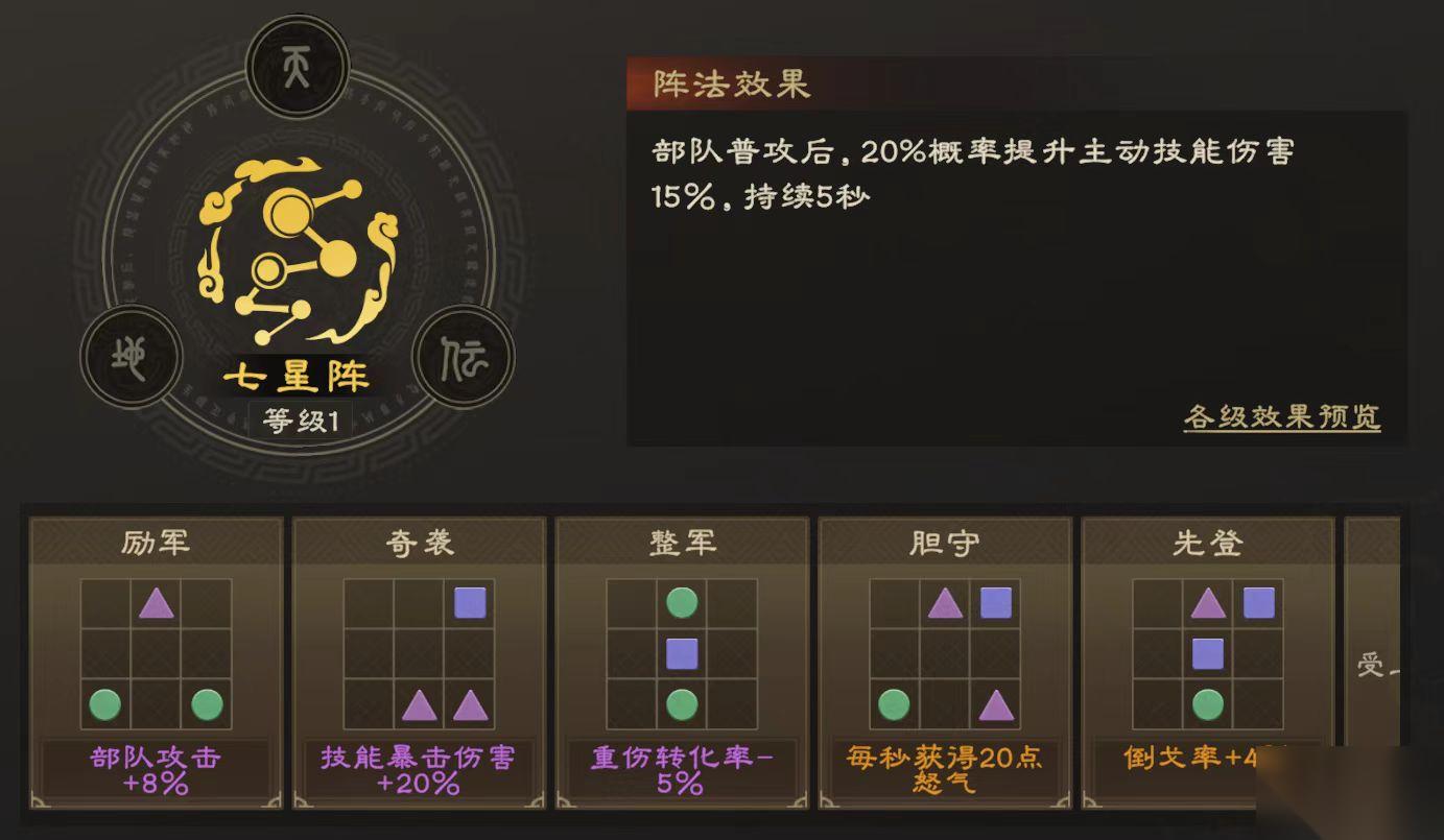 在游戏中通过提升军阶可以获得部分阵法,也可以通过活动获取,在招募过程中也可以得到阵法,七星阵就是属于阵法之一。七星阵的效果是在开启之后,部队进行普攻时有20%的几率,提升主动技能15%的伤害,持续5秒钟。七星阵是属于珍品阵法之一,在普攻时通过伤害提供额外的乘区,暴击上限高,技能增伤更稳定。七星阵主要用于技能体系,如果大家想要走主动技能伤害类型,那么选择七星阵是最佳的搭配。