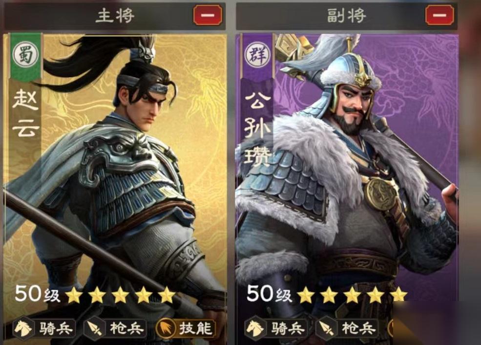 第2套可以选择赵云、公孙瓒的搭配方式,这是新手玩家在开荒时期最主要的阵容之一,选择七星阵也非常适合。公孙瓒可通过被动,提升队伍的技能伤害和暴击率,两个武将都可以通过主动技能去打伤害,这样就能发挥七星阵的威力了。如果抽到其他的技能型武将之后,可以将公孙瓒替换掉,和赵云一起就能一直使用下去,比如张辽、夏侯惇等,都很合适。