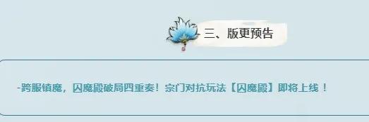 1、这个囚魔殿,记得没错的话,该玩法的第一次爆料在3月20号的更新公告里面,到目前已经有一个半月了!据官方描述:跨服镇魔,囚魔殿破局四重奏!宗门对抗玩法即将上线!估计和上古器灵差不多,4个宗门去镇魔获得积分,然后有一个时间点需要抢……