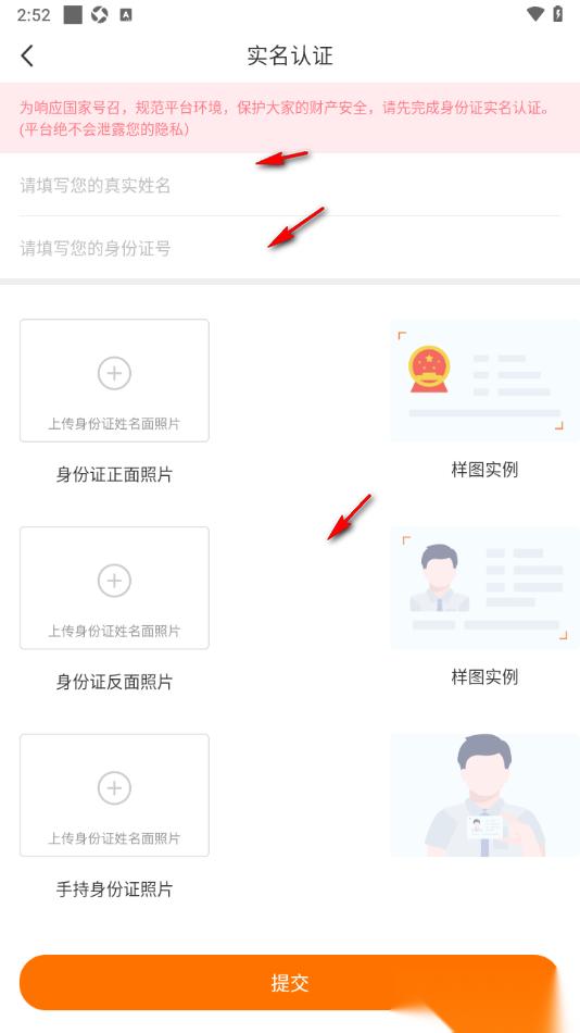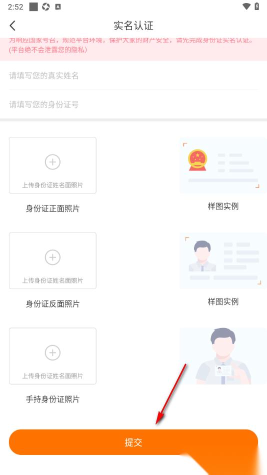 4.之后再上传自己的身份证正面和反面的照片,再点击下方的【提交】按钮即可保存,如图所示。