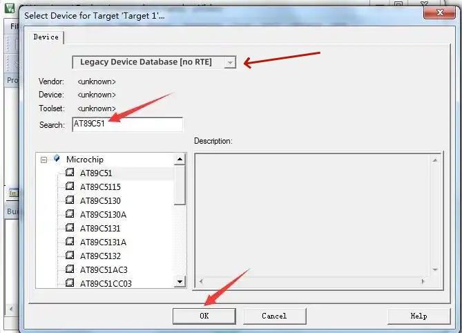 2、点击选择下拉框“Legacy Device Database [no RTE]”保存,接着选择单片机的型号,通常选择Intel中的第一个51内核型号,最后点击“OK”完成就可以了。