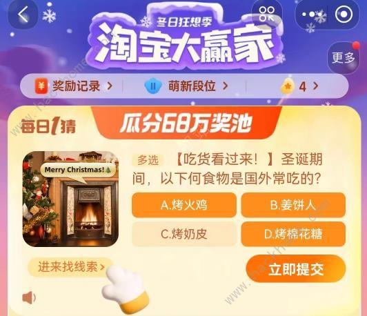 淘宝大赢家今日答案12.24分享 圣诞期间以下何食物是国外常吃的