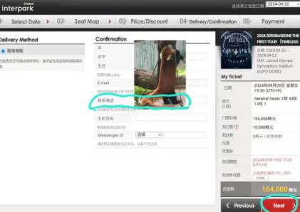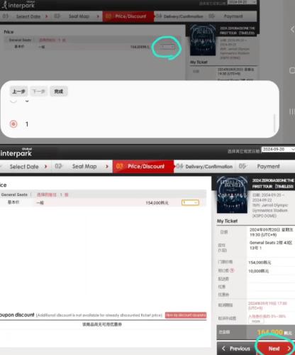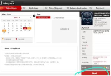 5. 页面成功跳转后即为暂时锁座成功,如果买1张票,则下拉列表中选择相应票数1,以此类推。完成后点【next】。