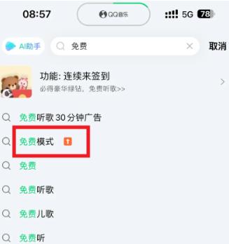 打开qq音乐app,在首页的顶部输入免费,在这里就可以进去看试听页面,选择-免费模式进入;
