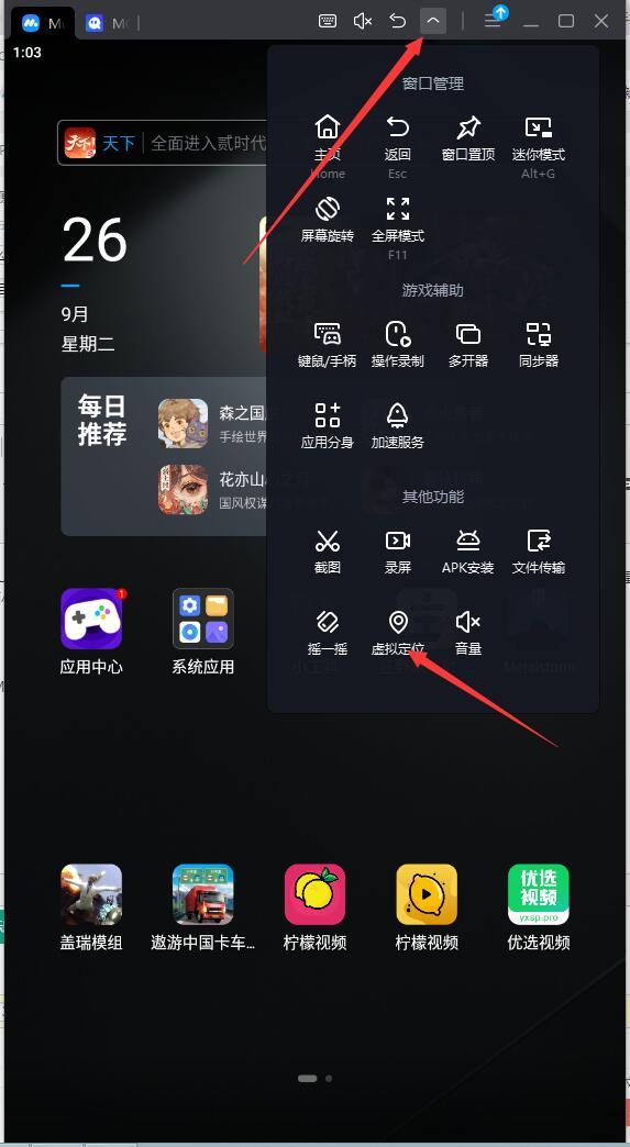 1、打开MUMU模拟器(这里使用的是MUMU模拟器12最新版本),点击上面的向下箭头;