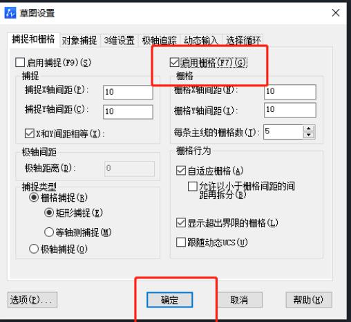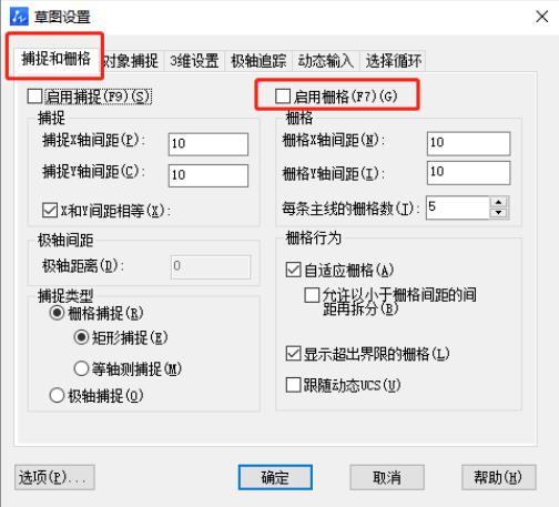 2、在打开的窗口界面中,点击上方中的"捕捉和栅格"选项卡,找到下方中的"启用栅格",将其小方框勾选上。