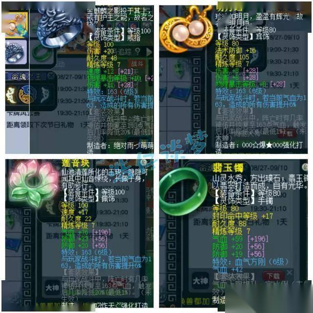 戒指和耳饰下排都是双伤害一物暴,配饰和手镯下排都是双防御一气血,全部打了7锻星辉石。