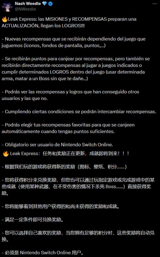 近日,任天堂消息人士Nash Weedle爆料称,任天堂即将为Nintendo Switch Online会员更新任务和奖励系统,还将推出一个新的成就系统。