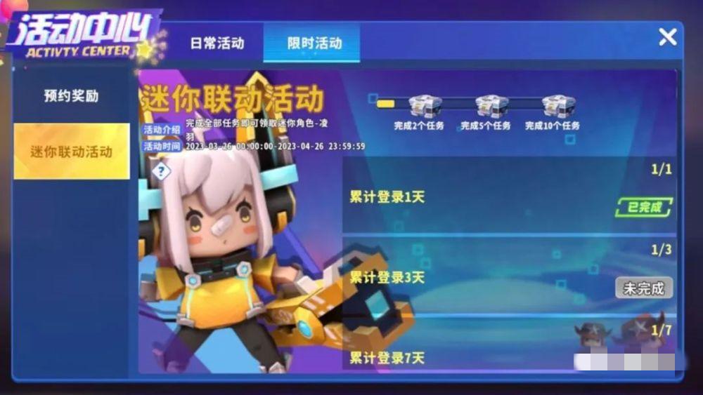 再然后回到《迷你枪战精英》,点击页面左侧的“活动”按钮,在“限时活动”中找到“迷你联动活动”。在3月26日-4月26日期间,完成活动页面右侧的十个任务之后,再前往活动页面选择凌羽或者诺娜娜其中之一。之后永久皮肤将发放到你报名的那个迷你号中了。活动时间有限,想要免费皮肤的小伙伴们要抓紧了。