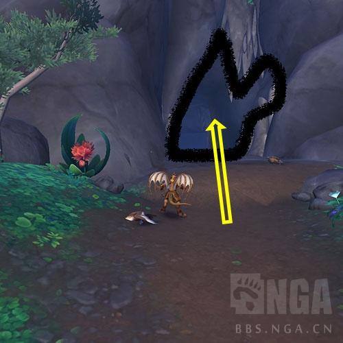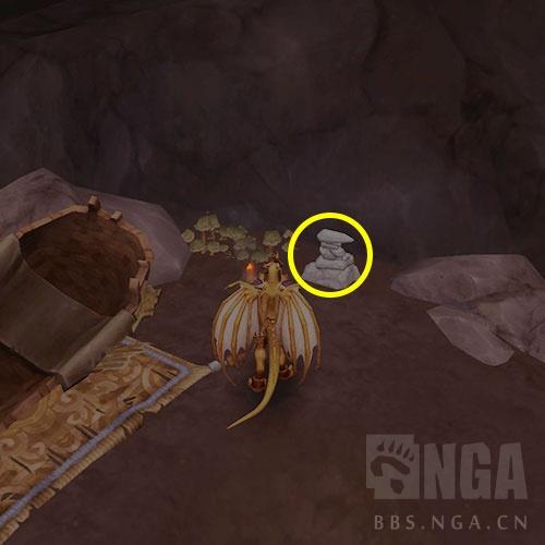然后我们来到 剪河交汇口, 这里有个山洞, (山洞 入口不是很醒目,这里特别做了截图), 我们飞进去以后上二层. 能看到一个 石堆, 和其交互~