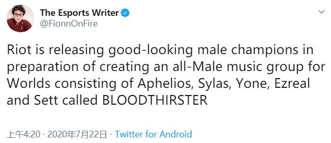 根据ESPN媒体电竞记者Fionn的最新爆料,他表示拳头游戏上线了一些帅气的男性角色,打算在今年的世界赛中推出一个全男性成员组成的音乐团队,包括厄斐琉斯、塞拉斯、永恩、伊泽瑞尔和瑟提,这个男团组合的名字是“BLOODTHIRSTER”,也就是游戏装备饮血剑的英文名字。目前,我们还无法确认这个消息是真是假。