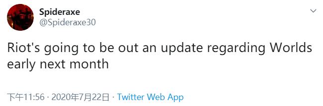 不管S10全球总决赛能否举办,拳头游戏都要给予玩家一个明确答复了,以免继续吊着玩家。和拳头游戏熟悉的舅舅党Spideraxe今天早些时候在个人推特上,也是透露了一个消息,他表示拳头游戏打算在下个月初,更新世界赛的相关资讯,届时会有更多新闻放出。