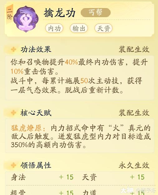发生X系反应意思就是,释放带有属性标签的绝技后会带有一层属性,例如上方的【集中】,当我们携带丐帮的擒龙功,释放降龙十八掌之后使用内力招式,就会触发火系反应。