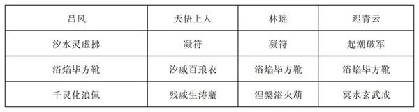 第一回合:吃法力丹,天悟上人打出三清化水符、五行化水咒,吕风复制三清化水符并全部打出,迟青云打出五行化水咒和衍水决,天悟上人打出断水龙威,林瑶打出燎原决,涅槃咒和战意决。如果有火灵气可以将林瑶的出牌顺序提前让战意决吃到火灵气的加成。迟青云打出轮回断水击。