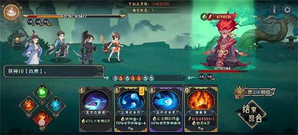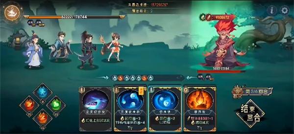 第三回合:吃法力丹,天悟上人打出三清化水符、五行化水咒,吕风复制三清化水符并全部打出,迟青云打出五行化水咒和衍水决,天悟上人打出断水龙威,林瑶打出燎原决,涅槃咒和战意决。如果有火灵气可以将林瑶的出牌顺序提前让战意决吃到火灵气的加成。迟青云打出轮回断水击。