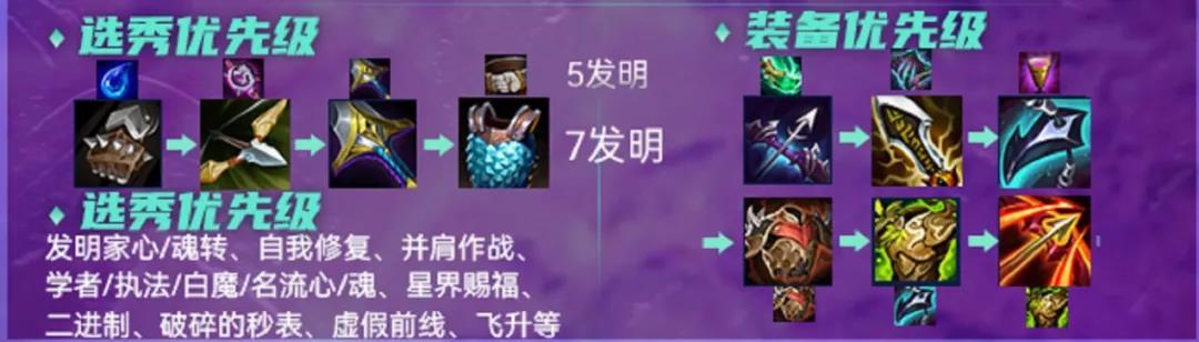 3阶段:3-2升级6人口,现在版本赌狗较多,如果阵容质量较差可小D卡,稳血后就攒钱准备升级人口。3-3海克斯如果有发明心就考虑走7发明,如果没有就摇摆5发明、学者拼或圣盾白魔圣杯拼。6人口添加棋子最优就是塔里克,不仅能增强阵容坦度与续航,占名流格子棋子还能增加输出能力。如果有萨勒芬妮可直接考虑5发明,这版本发明熊坦度大大增强,熊+辛吉德+塔里克的坦度极其优质。