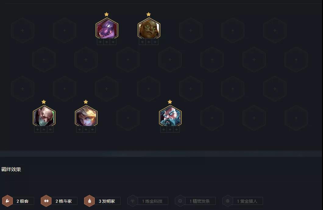 4阶段:4-1升级7人口,这时候看需要看自身阵容强度,如果强度够,能稳定血量,就攒钱准备4-5升级人口8人口。如果质量较低就一定要搜卡,赌狗大部分成型,不提升质量会稳不住血量。阵容方面开5发明羁绊,这时候圣杯的收益就变得非常高,大头、萨勒芬妮与奥莉安娜的技能伤害会非常足,稳血后就准备升级8人口。