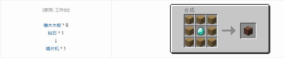 手持任意种类的音乐唱片放入唱片机,唱片所对应的音乐便会播放,放入不同的唱片会给周围的红石比较器输出不同强度的红石信号。