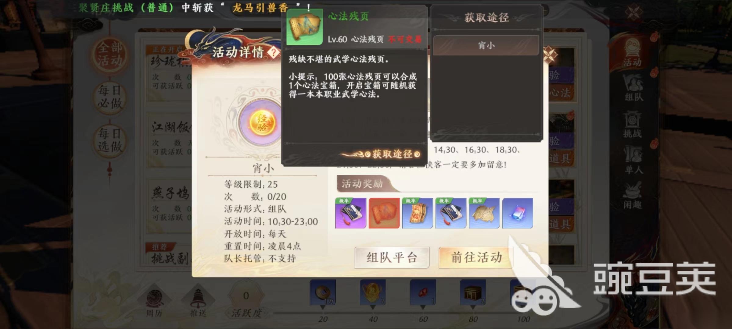 战斗胜利之后,可以获得的奖励也很丰厚,有武学心法,心法残页和藏宝图以及大量宝石等奖励,尤其是宝石,除了直接购买之外,这项活动是最重要,还有武学心法提升也不可忽视。