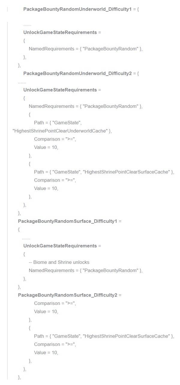 可以看到四者均有要求 NamedRequirements = { "PackageBountyRandom" },而两个超级试炼还额外要求 "HighestShrinePointClearUnderworldCache">=10 与 "HighestShrinePointClearSurfaceCache">=10,即至少需要以 10 恐分别通关一次地下和地表。