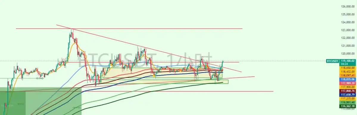 支撑,短期参考 117,000 4 小时支撑,关键支撑参考 113,700。扩大支撑范围防范今晚可能存在的较大波动。阻力,短期阻力 119,000,关键阻力前高 121,000 位置,该位置再次突破并且站稳,可以尝试看新高。