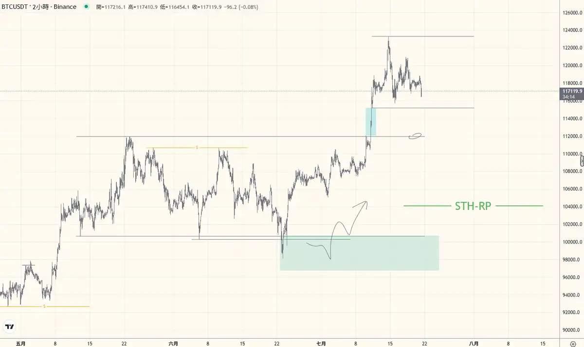 这个 112K 的逻辑很简单:它是 5 月 9 日至 7 月 9 日这段时间盘整区的顶部,而在 7 月 10 日,价格曾强势突破该区域。我们可以暂时假设,这段盘整区是主力资金阶段性吸筹的区域。