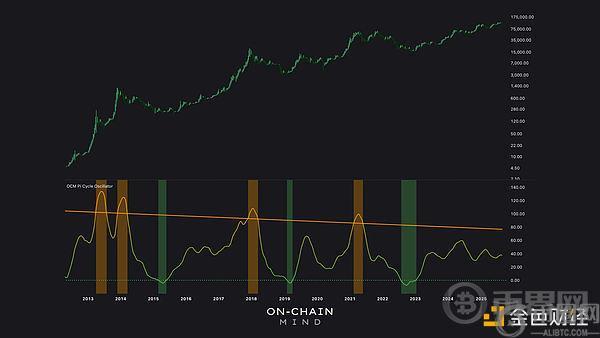 为了解决这些局限性,Pi 周期顶部震荡指标将传统的交叉点转变为持续的、实时的风险和周期定位衡量指标。该振荡器并非提供单一的二元信号,而是计算 111 日和 350 日×2 的简单移动平均线之间的百分比差异,并将其归一化为可读的数值。