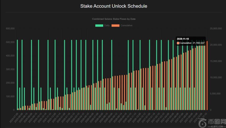 最近 Galaxy 和 Pantera 分别宣布了 12.5 亿美元和 10 亿美元的 SOL DAT 计划,加上 Sol Markets 的 4 亿美元,总计约为 25 亿美元(扣除相关费用)。问题在于,这可能不会对 Solana 的价格产生实质性影响,因为目前市场上锁定的 SOL 可以被这些实体购买或分配。根据@4 shpool(gelato.sh) 的数据,直到 2028 年还有约 2100 万单位 SOL 待解锁,总价值约为 40 亿美元。粗略计算(更详细的模型分析可以由专业金融分析师提供)显示,“FTX 遗产 SOL”约占剩余解锁量的四分之一。