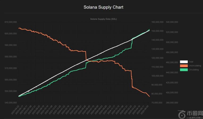 另一方面,Solana 的通胀问题也值得关注。目前通胀率通常被认为是 7-8%,但实际通胀率约为流通供应量的 4.5%。这意味着,如果第 839 个周期约 6.08 亿 SOL 的供应量计算,一年后供应量将增加约 2750 万(通胀)和 1000 万(解锁),总流通量达到约 6.455 亿,通胀率约为 6.2%。再次强调,这只是纸上谈兵的计算,我会让更有经验的分析师看看,并为您提供更准确的图表。