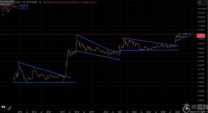 值得注意的是,从 2021 年开始,XRP 再次进入长期盘整,形成了广泛的下降三角形格局。直到 2024 年 11 月,XRP 才向上突破,并迅速重新估值,突破了 1 美元、2 美元和 3 美元的心理关口。