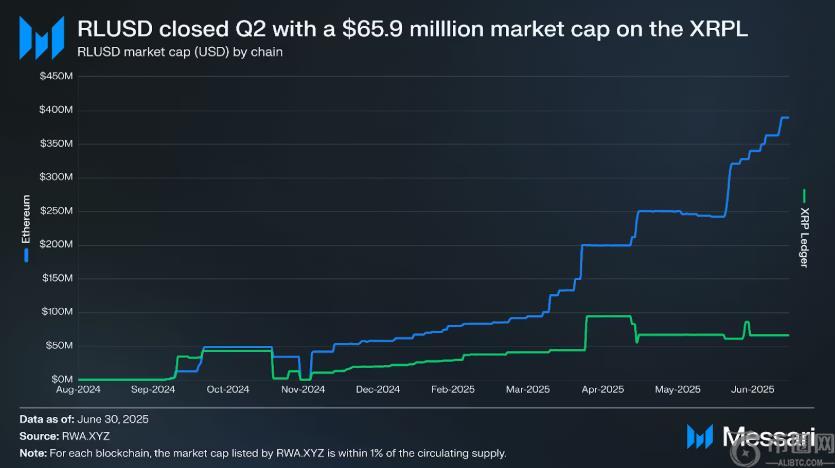 以太坊上的 RLUSD 同样表现强劲,从约 2 亿美元飙升至近 3.9 亿美元,使其估值在第二季度末达到 4.552 亿美元。