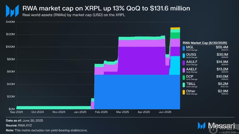 与此同时,XRP Ledger 上的瑞波币美元(RLUSD)也实现了环比增长,继续渗透到蓬勃发展的稳定币市场。这种与美元挂钩的加密货币的市值在第二季度增长了 49.4%,达到 6590 万美元,成为账本上最大的稳定币。