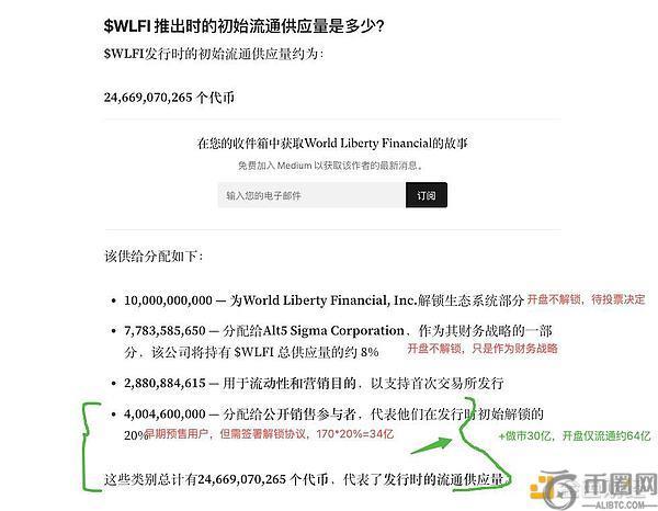 首先,WLFI的总供应量是1000亿,发行量虽大,但多是“锁仓”状态,有一类人可以卖:早期参与了那两轮公募的“预售用户”,但也只能解锁20%,剩下的80%怎么办?等以后大家投票再定。