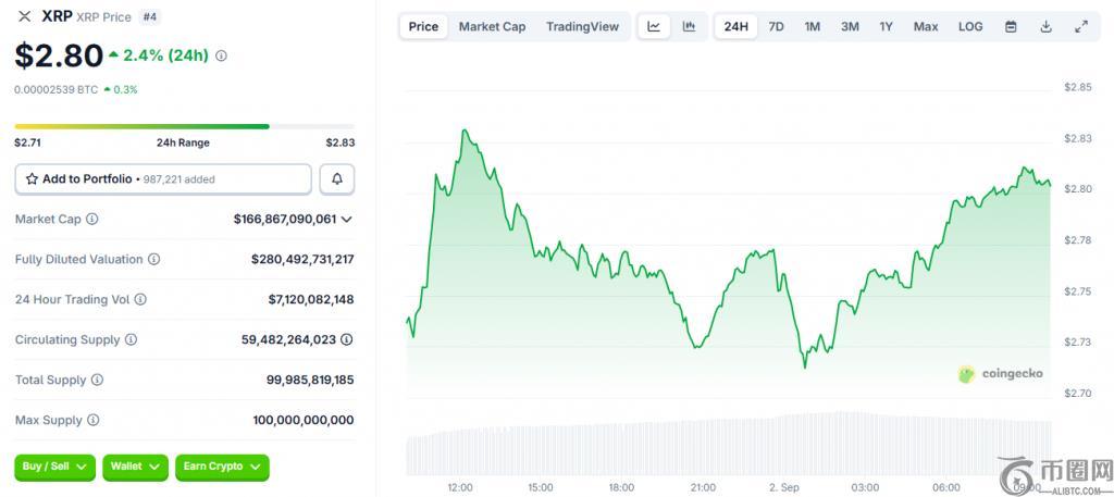 CoinGecko 透露,XRP 目前交易价格为 2.80 美元较近期历史高点下跌了 25%。尽管出现回调,XRP 在交易所的储备仍在持续增长,每日 1774 万美元的清算中,有 1480 万美元是多头仓位。