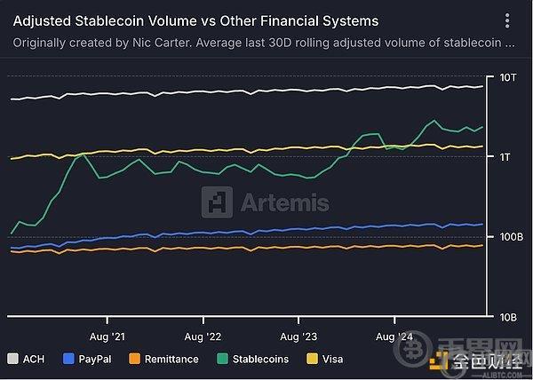 • 交易量超越支付巨头:2024 年9月起稳定币单日交易额持续超过VISA通道的交易量,甚至一度达到 5.1 万亿美元的峰值。