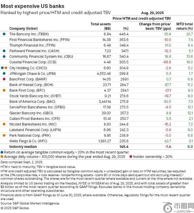 银行排名依据的是调整后的有形账面价值,即“有形普通股权益、损失准备金和持有至到期证券的未实现损益之和,按21%的公司税率进行税前调整,减去不良资产和逾期90天或以上但仍在产生利息的贷款,除以流通在外的普通股”。