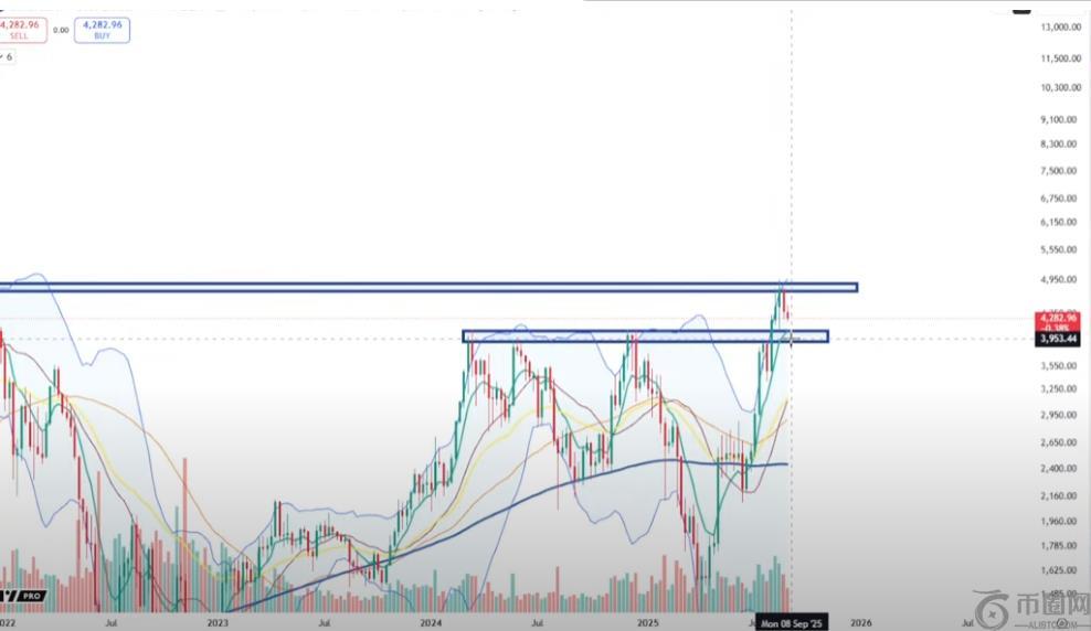因此,尽管从扩大楔形开始出现了稳步上涨,但它在历史高位停顿了下来,所以这是阻力位。你在这里得到了支撑,而且很简单,以太坊很容易在这里上涨,因为你只要放大来看,就会说,如果我有机会,如果我再次进行看涨测试,出现回调,比如 3,950 美元、4,000 美元,我就会买入,你就已经触及了你的上方阻力位。描述得非常好。