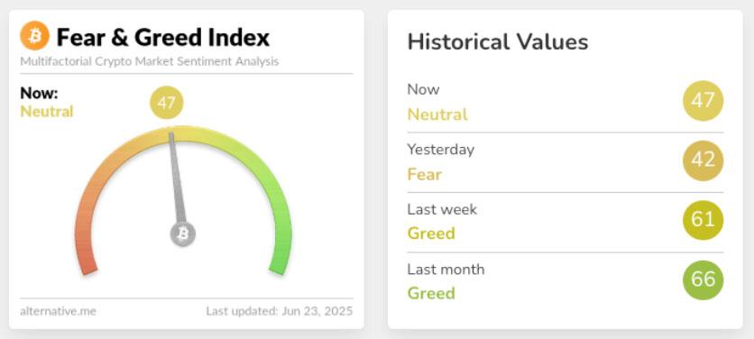 CoinShares的新加密ETP报告发布之际,加密恐惧与贪婪指数出现了一些显著调整,该指数显示市场情绪在周日降至“恐惧”,此前一个月一直维持在“贪婪”。到了周一,该指数略有恢复至“中性”。
