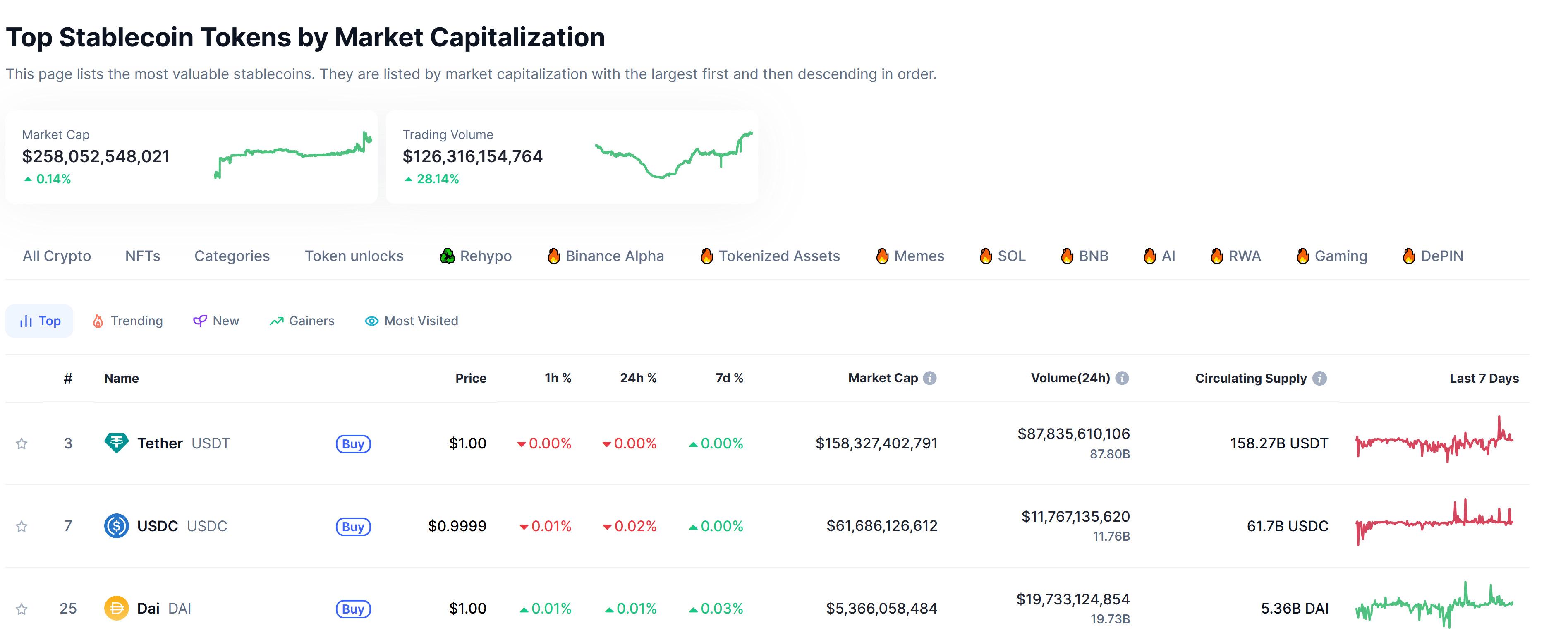根据CoinMarketCap数据显示,目前稳定币市值已超过2580亿美元。市值排名前十的稳定币均以美元计价。以欧元挂钩的EURC是市值最大的非美元稳定币,位列第十一。