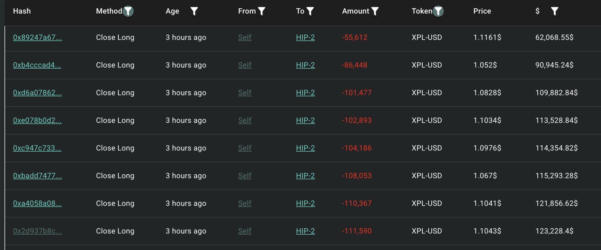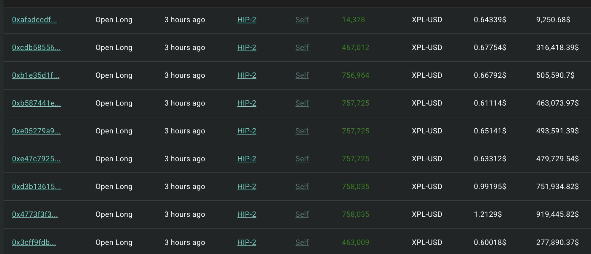 随后,该 0xb9c 开头地址在 8 月 27 日 5:36(UTC+8)开始下单多次做多 XPL(单笔规模大多在几万美元至几十万美元之间),并在 5:53(UTC+8)开始关闭多仓仓位。在 XPL 跌至 0.6 美元左右时,该地址再度做多 XPL。当前,0xb9c 开头地址在 Hyperliquid 上的 XPL 合约仓位价值为 828 万美元。