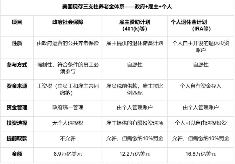 要理解这场变革的威力,首先需要看懂 401(k) 在美国养老金体系中的「C 位」角色。美国的养老金体系如同一座三足金鼎,共同支撑着国民的退休生活: