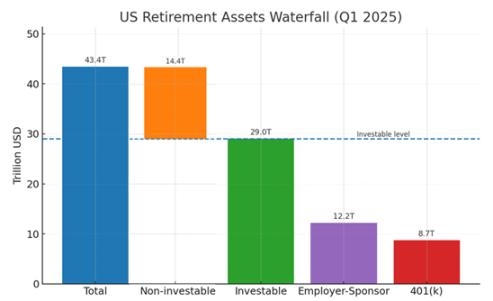 根据美国投资公司协会(ICI)2025 年第一季度的数据,美国养老金市场总规模高达 43.4 万亿美元。在这片广阔的资金海洋中,真正可由个人进行投资决策的部分约为 29 万亿美元。而在这 29 万亿美元中,401(k) 计划独占 8.7 万亿美元,占比高达 30%。这笔巨额资金,正是此次新政瞄准的「金矿」。